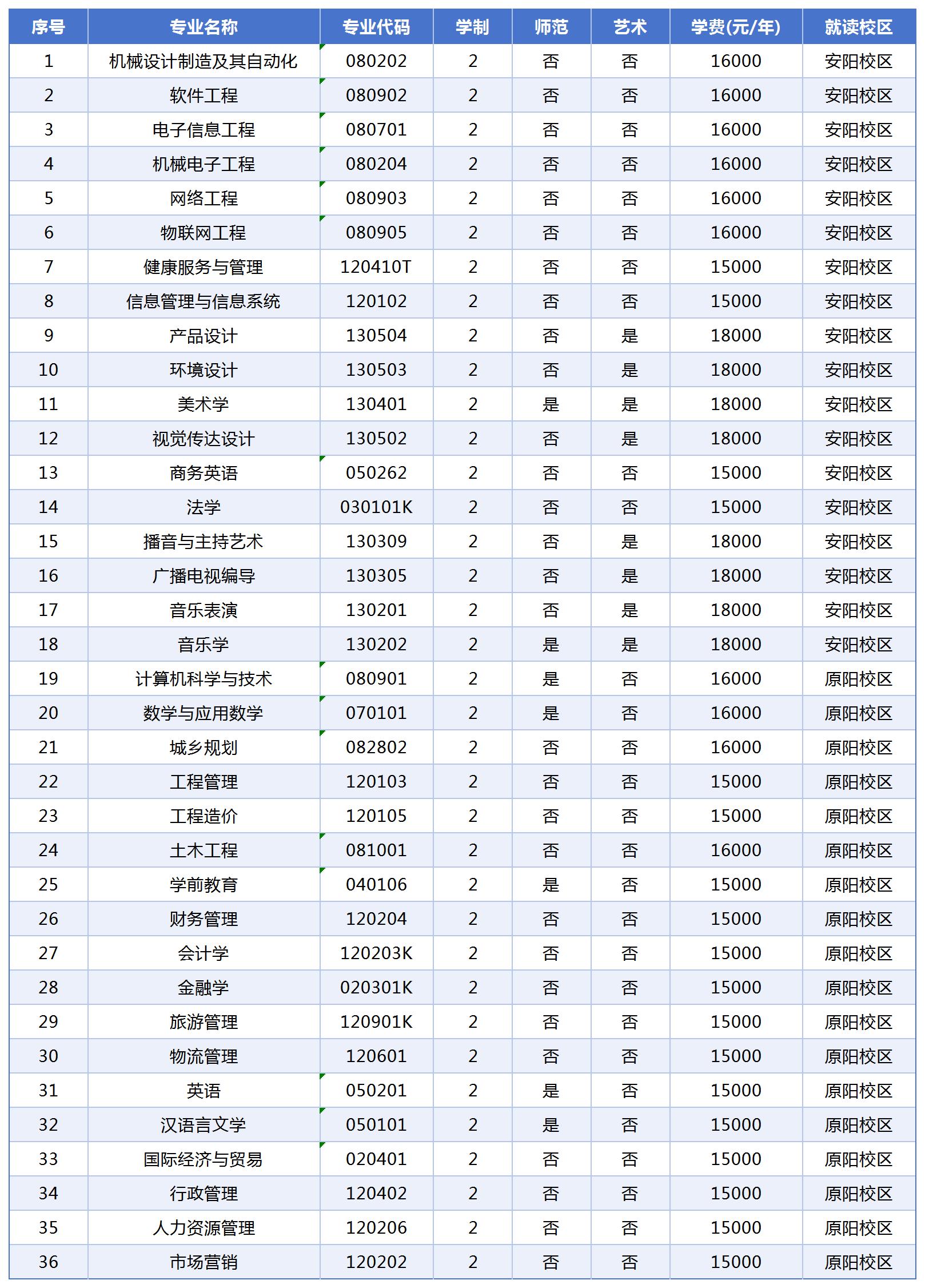 第十一条 就读安阳校区的专升本专业有机械设计制造及其自动化、软件工程、电子信息工程、机械电子工程、网络工程、物联网工程、健康服务与管理、信息管理与信息系统、产品设计、环境设计、美术学、视觉传达设计、商务英语、法学、播音与主持艺术、广播电视编导、音乐表演、音乐学。